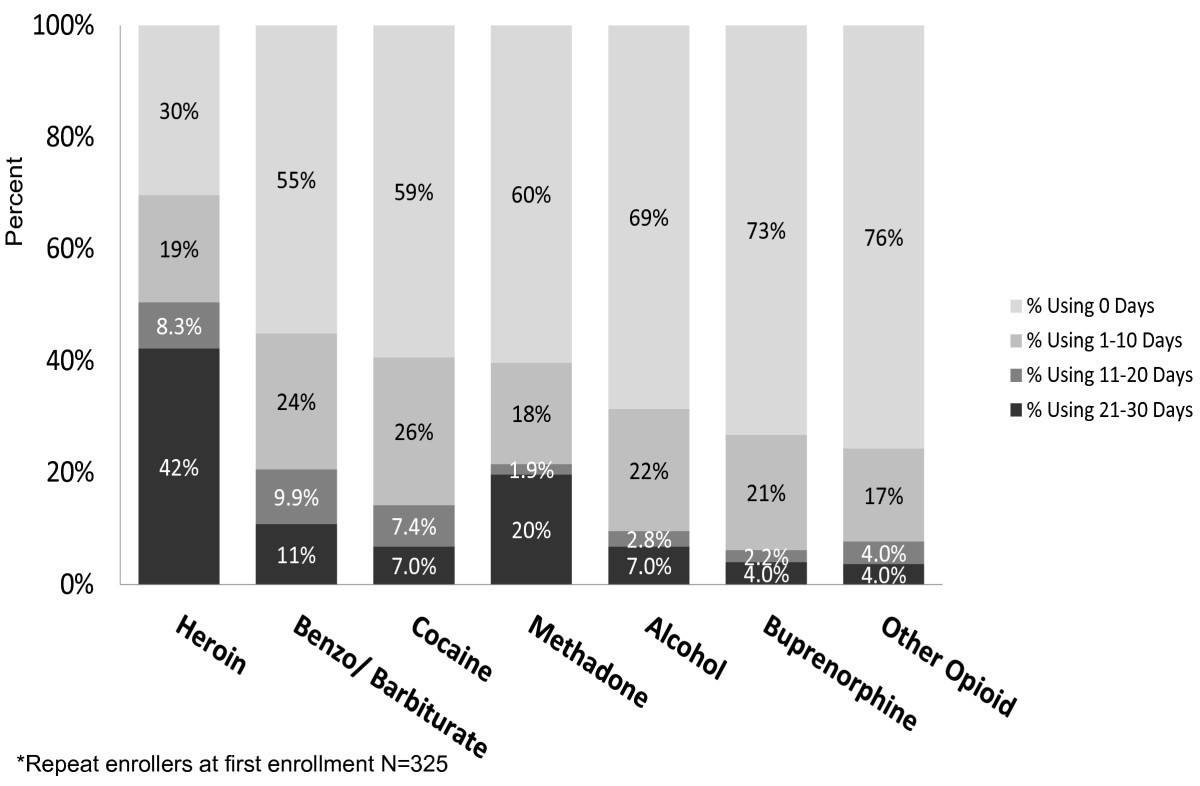 To examine frequency of use for each individual substance (heroin, benzodiazepine/barbiturate, cocaine, methadone, alcohol, buprenorphine, and other opioids), we created the following four categories from the enrollment questionnaire: those reporting no use in the past 30 days; 1–10 days of use out of the past 30; 11–20 days of use and; 21–30 days of use. We created a measure of number of substances used in previous 30-day period, defined as the sum of the number of substances (heroin, methadone, buprenorphine, other opioids, cocaine, alcohol, benzodiazepine/barbiturate and methamphetamine) that respondents reported consuming at least one day out of the past 30 days. We further categorized number of substances used as increased when a person reported a higher number at the second enrollment, compared to the first enrollment; decreased when a person reported a lower number at second enrollment compared to first enrollment, and; no change when the number of substances used stayed the same. We also measured the time between enrollments.